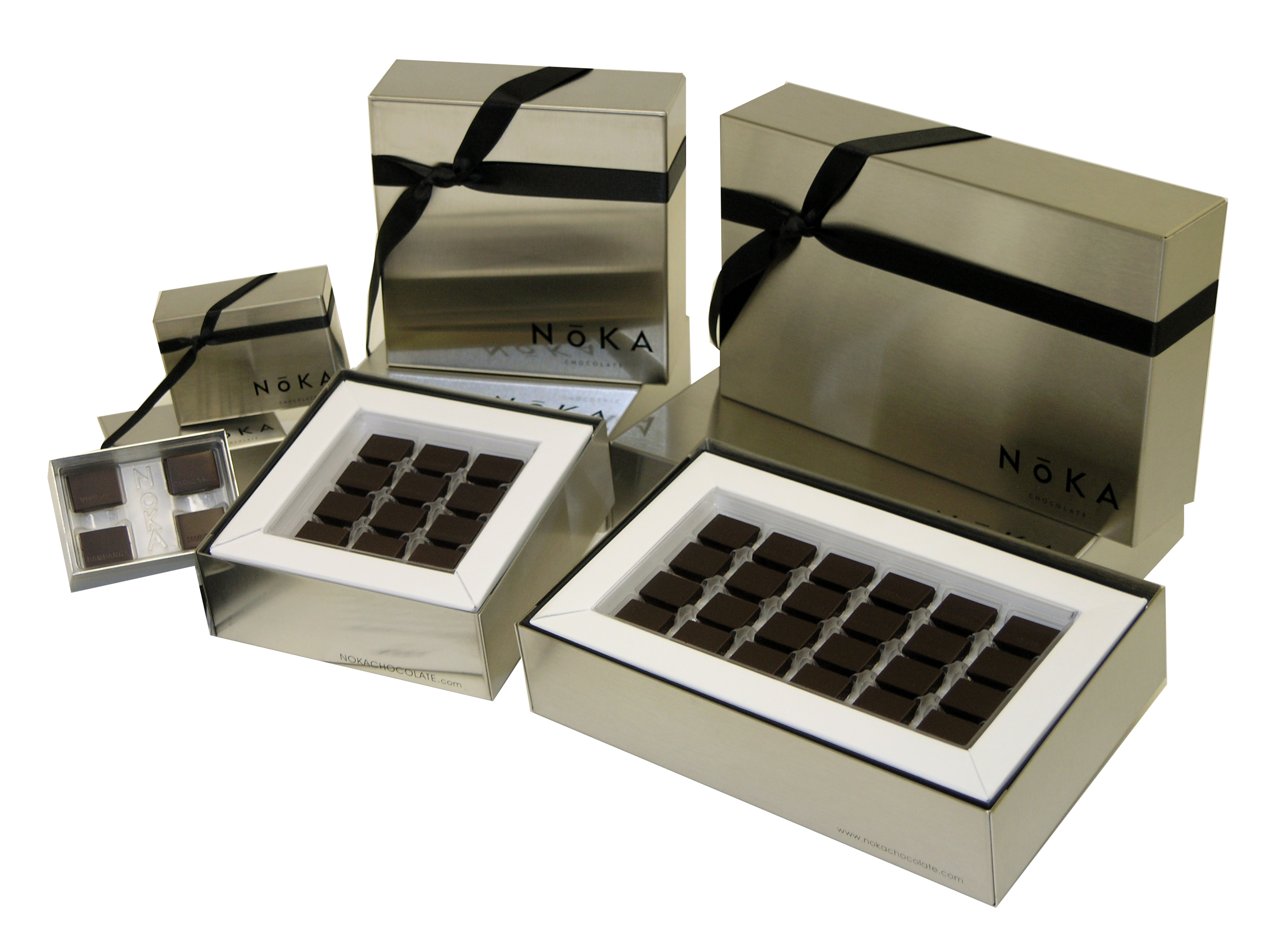 NOKA Chocolate offers The Vintages Collection™, a compilation of the finest single-estate dark chocolates, and The Grand Cru Collection™, handcrafted truffles made with rare, single-estate dark chocolate and fresh organic cream. Prices range from $16 for a 4-piece Encore Box™ to $234 for a Mixed Encore Collection™ that includes a 48-piece Vintages and a 24-piece Grand Cru. Prices for NOKA’s distinctive keepsake stainless steel Signature Box™ range from $39 (4-piece Vintages) to $209 (96-piece Vintages).